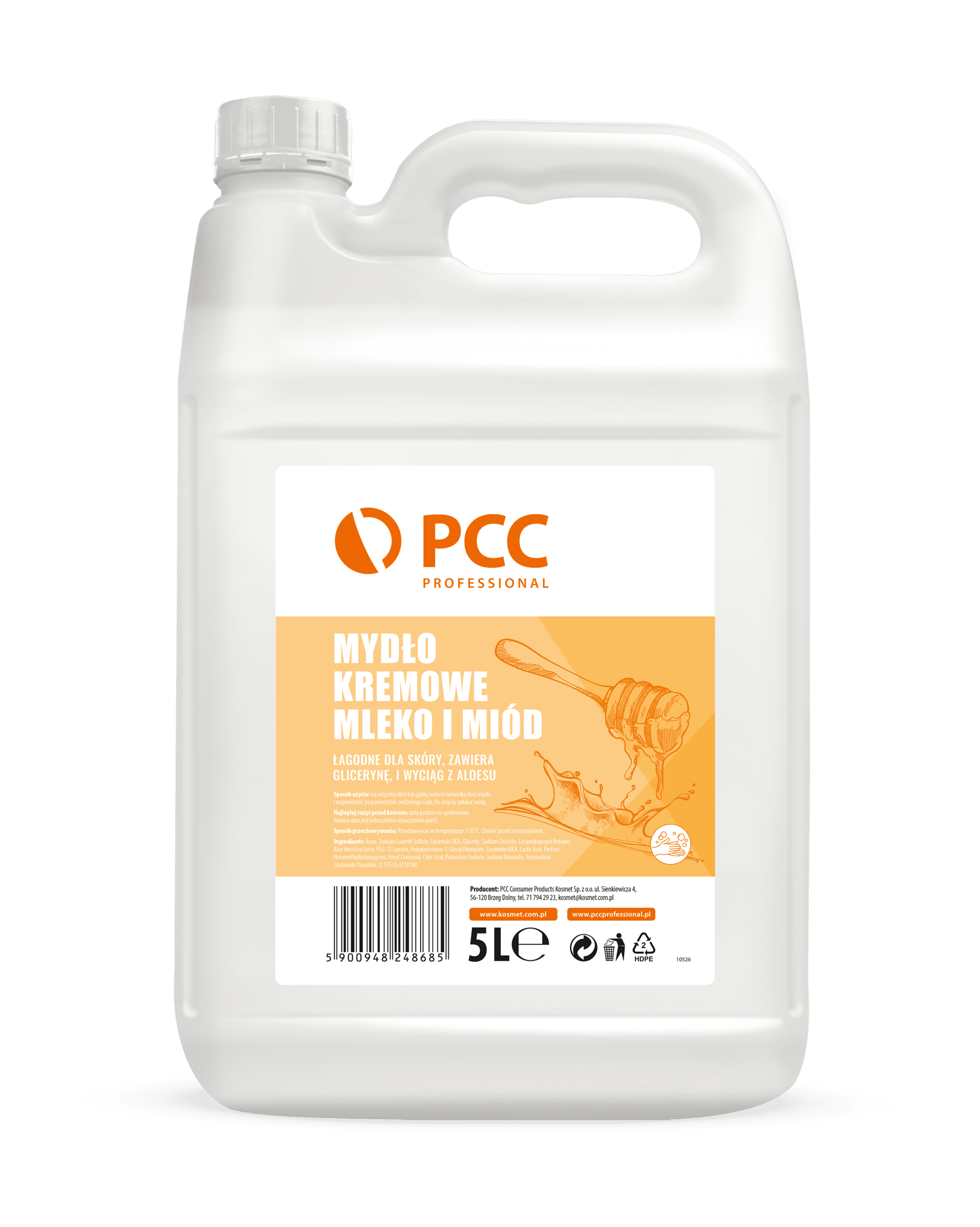 PCC PROFESSIONAL Milk and Honey CREAMY SOAP is a professional liquid soap for hand washing and care. The product owes its high quality and effectiveness to specially selected ingredients, which include high-quality surfactants and natural care additives, sourced exclusively from tested and qualified sources.