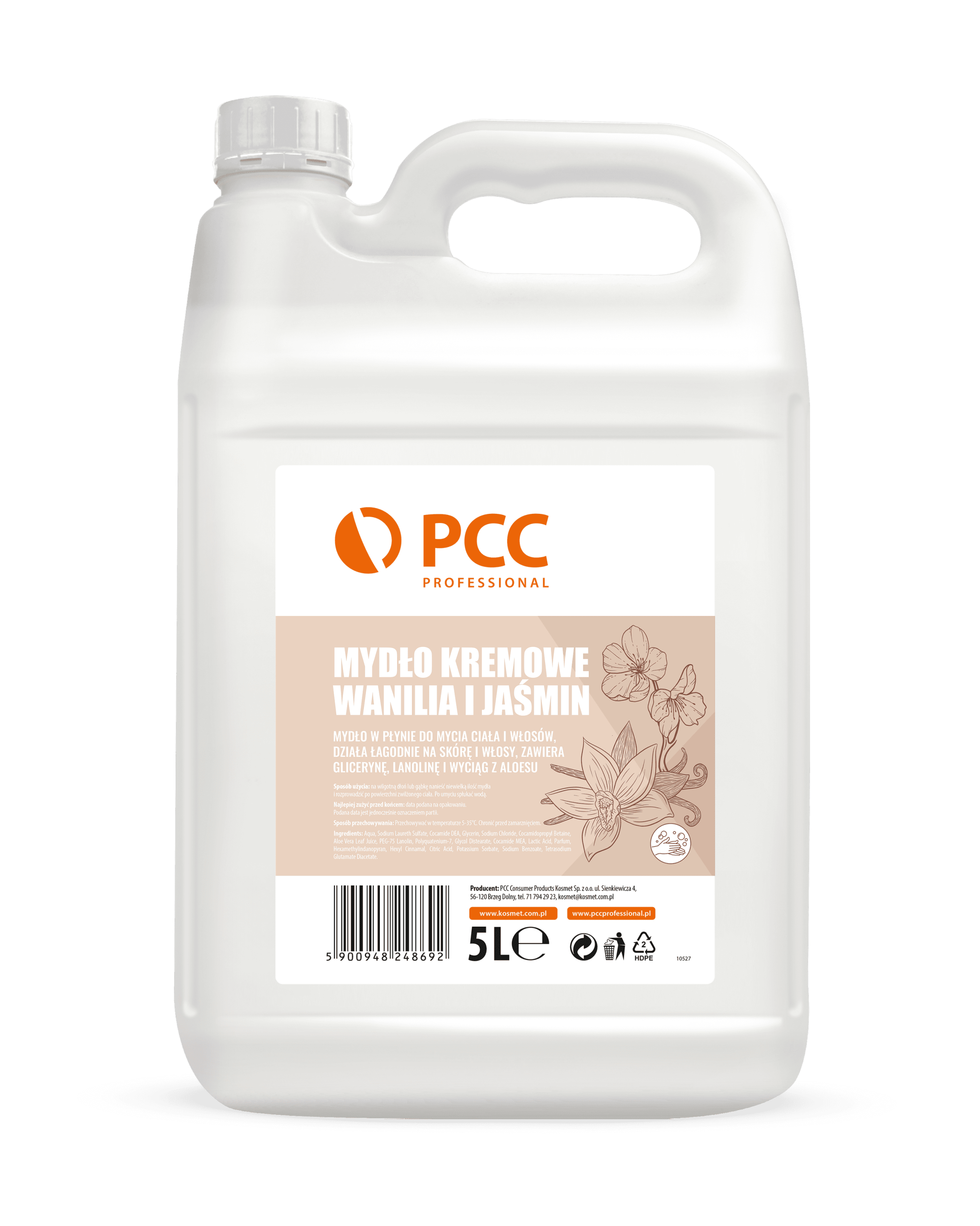 PCC PROFESSIONAL CREAMY SOAP Vanilla and jasmine is a professional liquid soap for hand washing and care. The product owes its high quality and effectiveness to specially selected ingredients, which include high-quality surfactants and natural care additives, sourced exclusively from tested and qualified sources.