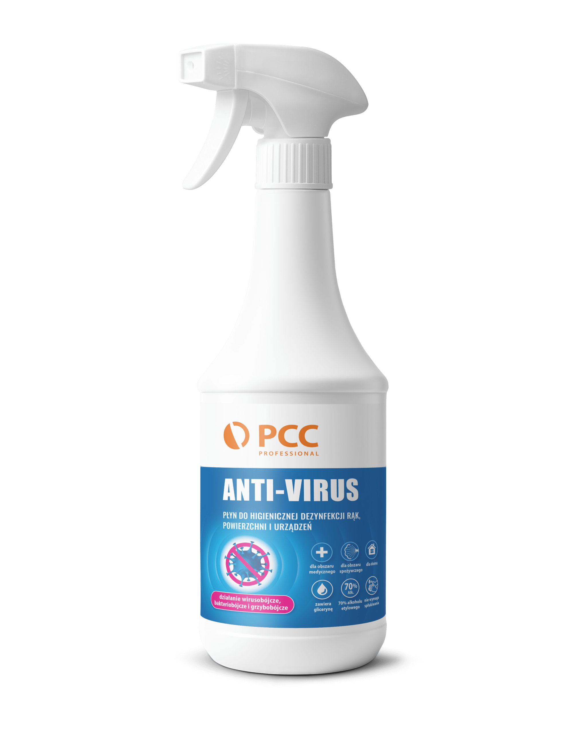 PCC PROFESSIONAL ANTI-VIRUS is an effective and efficient liquid for the hygienic disinfection of hands, surfaces and equipment. The product is recommended for disinfecting a variety of hard surfaces and equipment. Thanks to its active ingredient ethyl alcohol at a concentration of 70%, the product is highly effective. It has excellent virucidal, bactericidal and fungicidal properties. It is particularly recommended for use in medical and other areas requiring a very high level of hygiene.