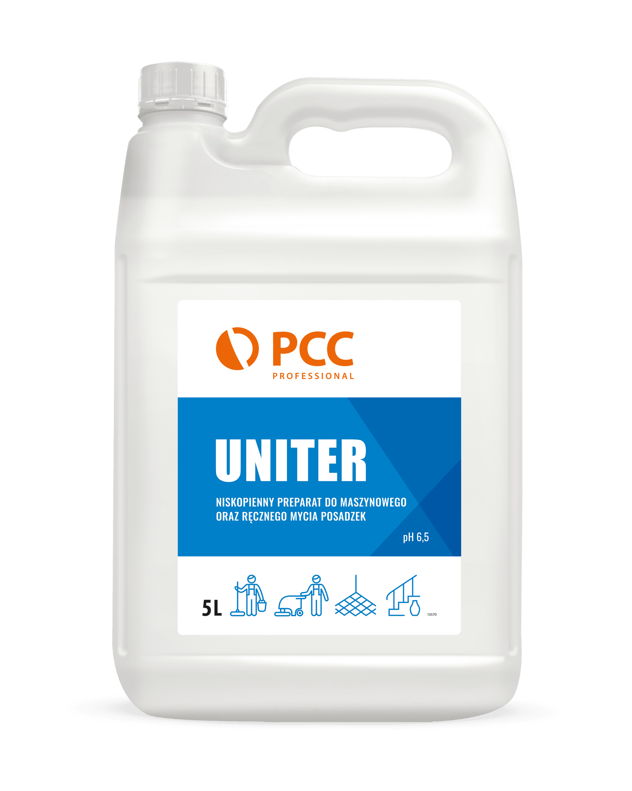 PCC PROFESSIONAL UNITER to skoncentrowany niskopienny preparat do czyszczenia na bazie alkoholu i terpenów to płyn do użytku profesjonalnego, stosowany do czyszczenia posadzek podłogowych odpornych na działanie wody. Zawartość alkoholu w preparacie sprawia, że produkt szybko wysycha i nie pozostawia żadnych smug. Środek usuwa zabrudzenia po flamastrach, długopisach oraz ołówkach.